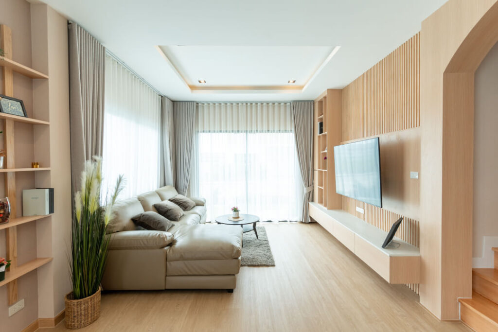 • สีโทนอ่อน เช่น สีขาว ครีม น้ำตาลอ่อน เทา หรือไม้ธรรมชาติ เพื่อให้บ้านดูอบอุ่นแต่สว่าง